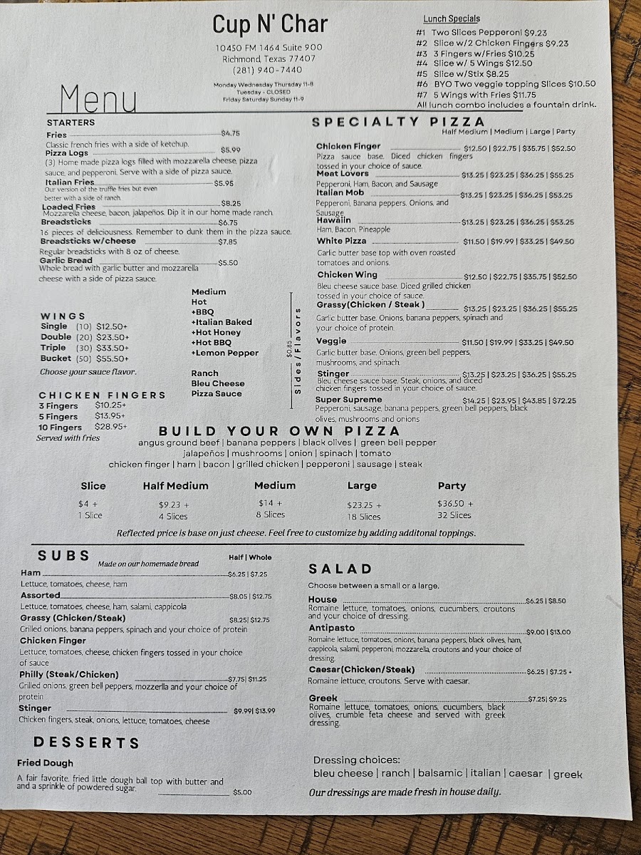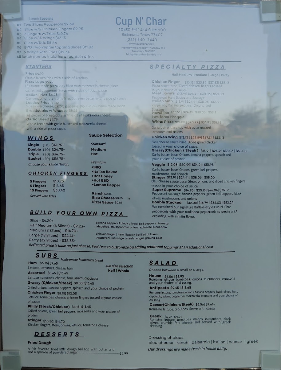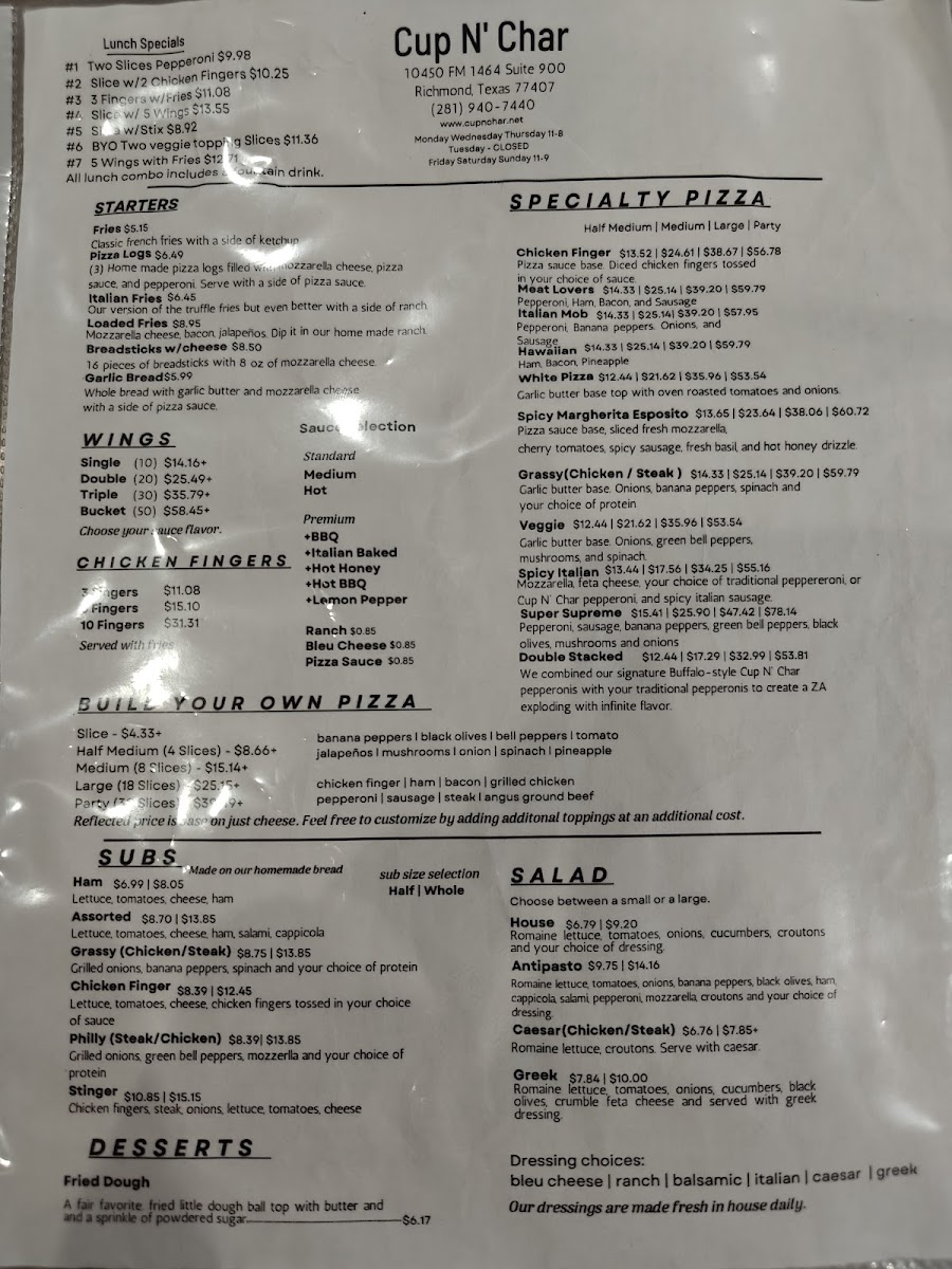The menu at Cup N Char Buffalo NY Pizza offers a variety of classic pizza restaurant fare with a focus on Buffalo-style pizza and wings. The selection is organized into several core groups to accommodate different dining preferences.
