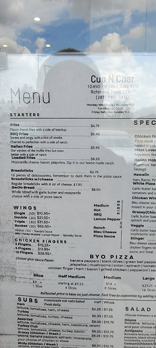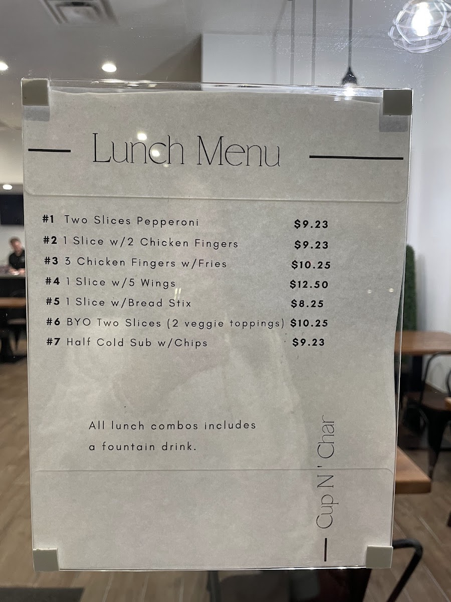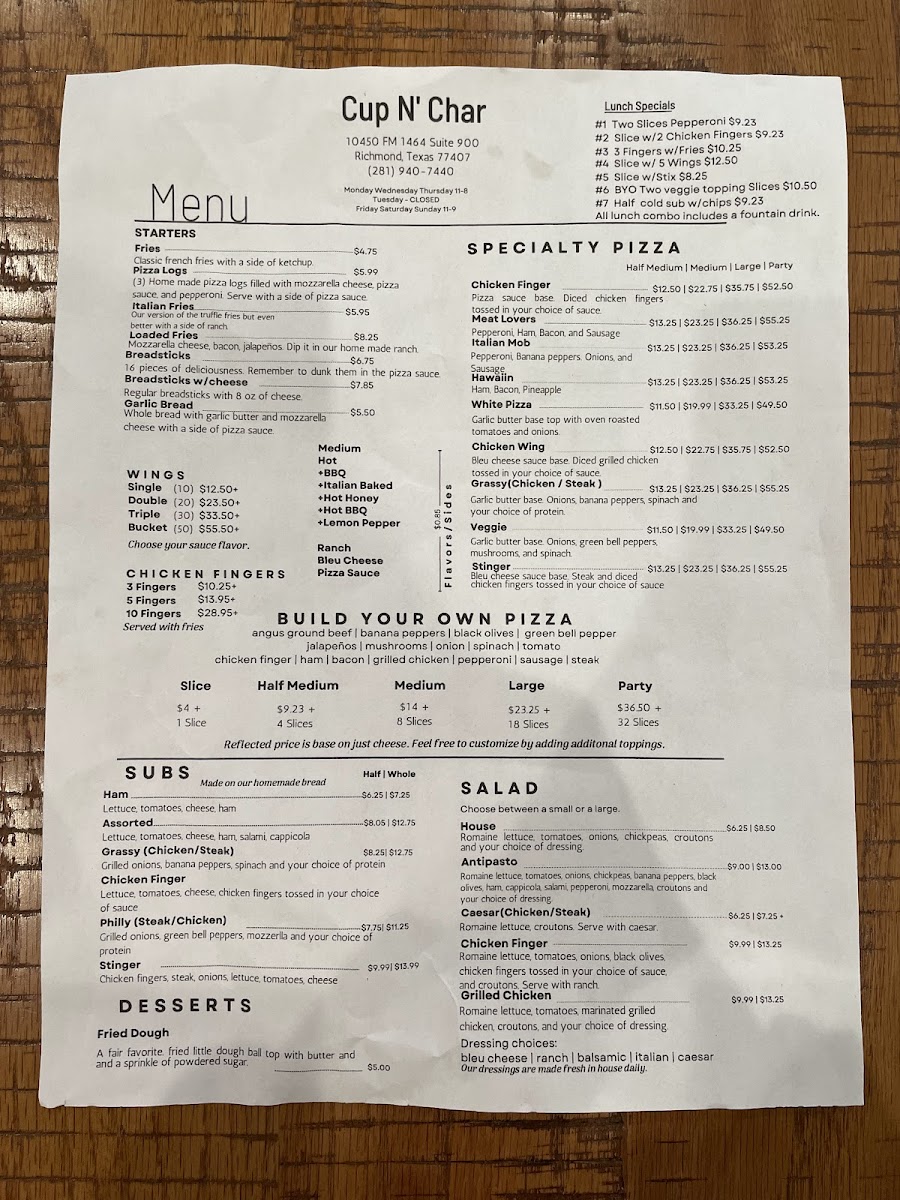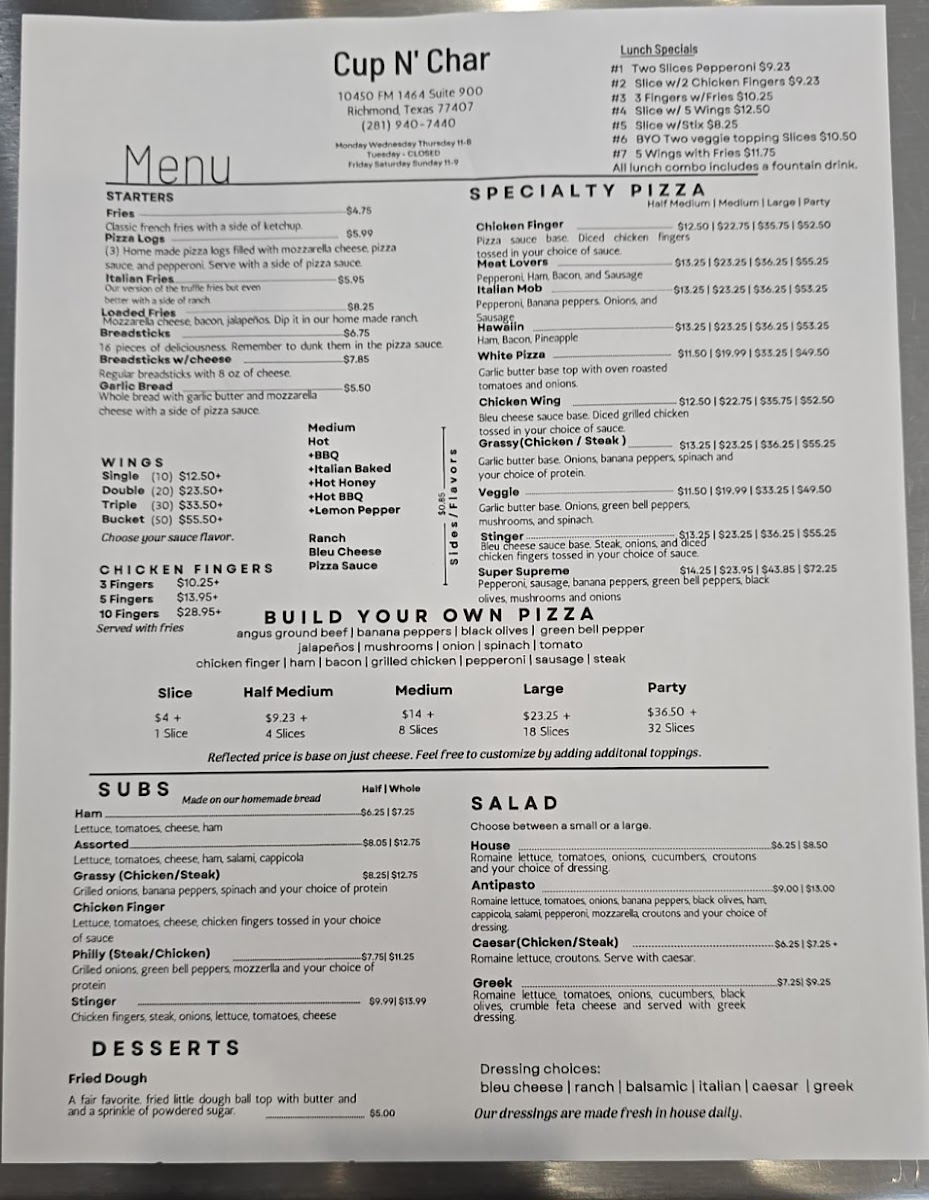 The menu at Cup N Char Buffalo NY Pizza offers a variety of classic pizza restaurant fare with a focus on Buffalo-style pizza and wings. The selection is organized into several core groups to accommodate different dining preferences.