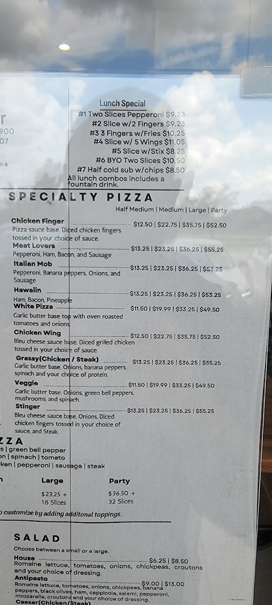 The menu is suitable for casual dining or takeout, offering quick order options such as individual pizza slices and finger foods. This variety serves a range of meal occasions from light bites to full meals centered around traditional Buffalo-style pizza and wings.
