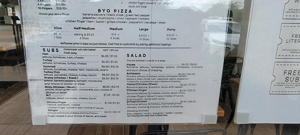 Wings and Sandwiches: Buffalo Wings, Hot Lemon Pepper Wings, and a Buffalo Chicken Sandwich are featured alongside other options such as a Chicken Finger Sub and a BLT Sub, offering a mix of traditional wing flavors and sandwiches.